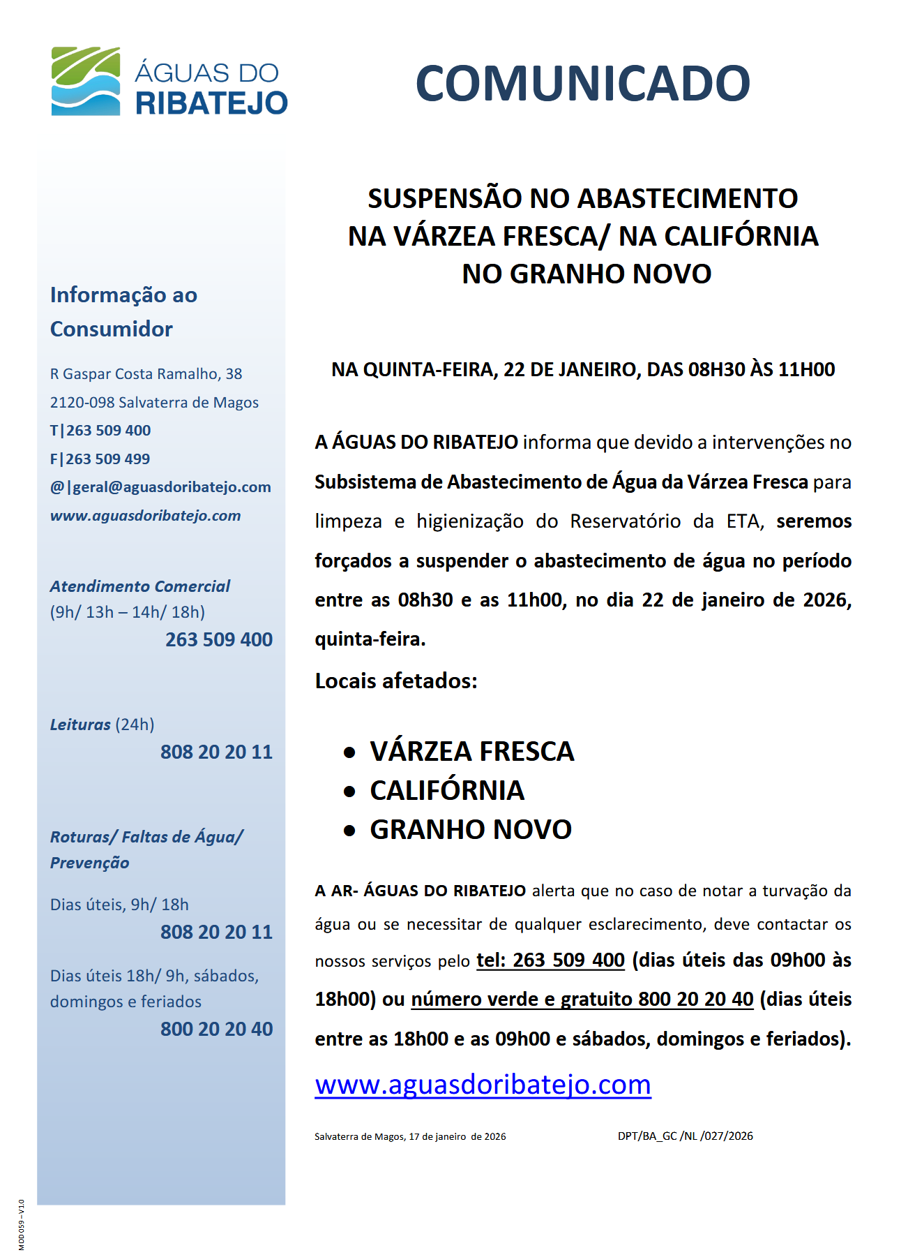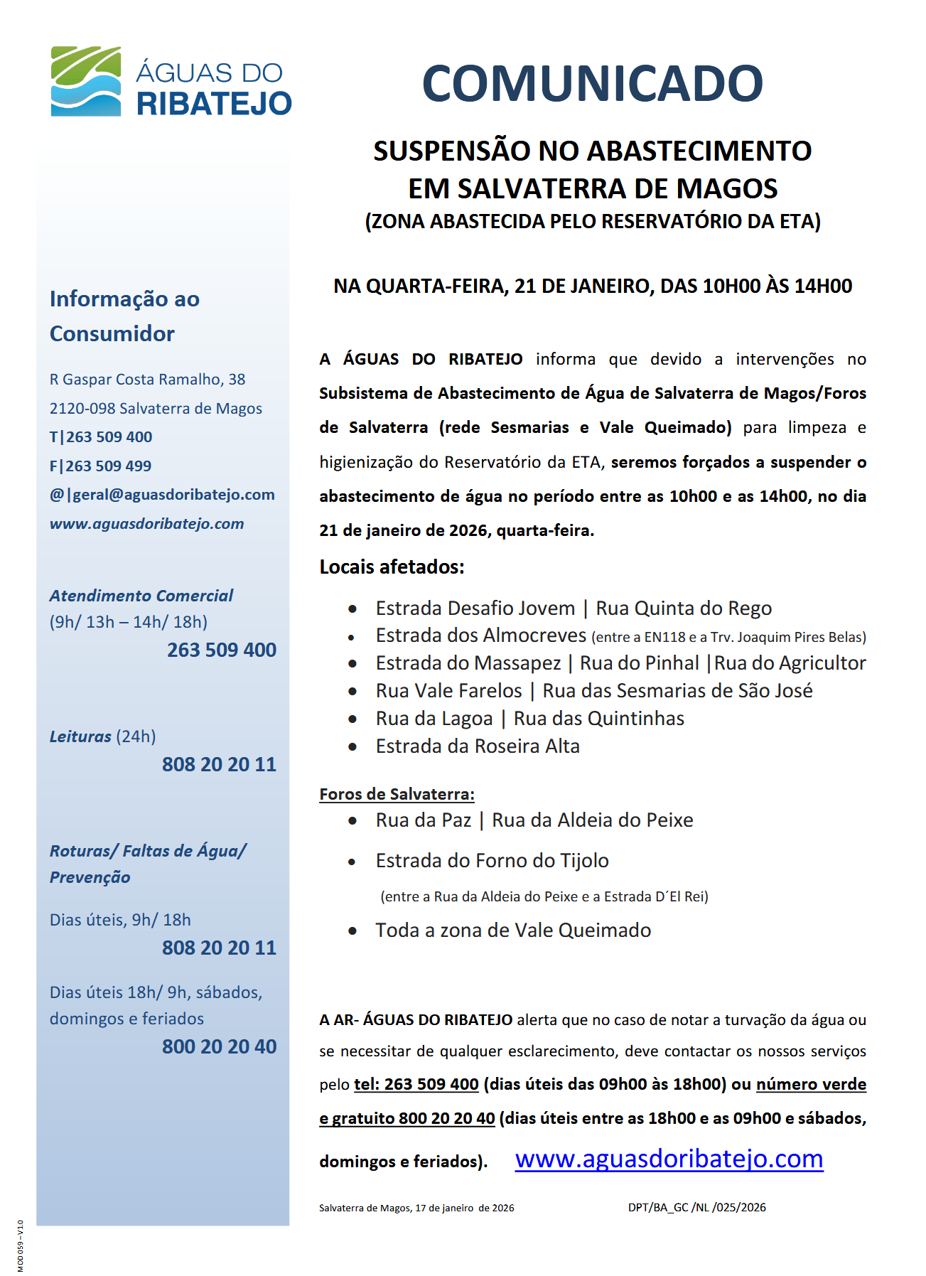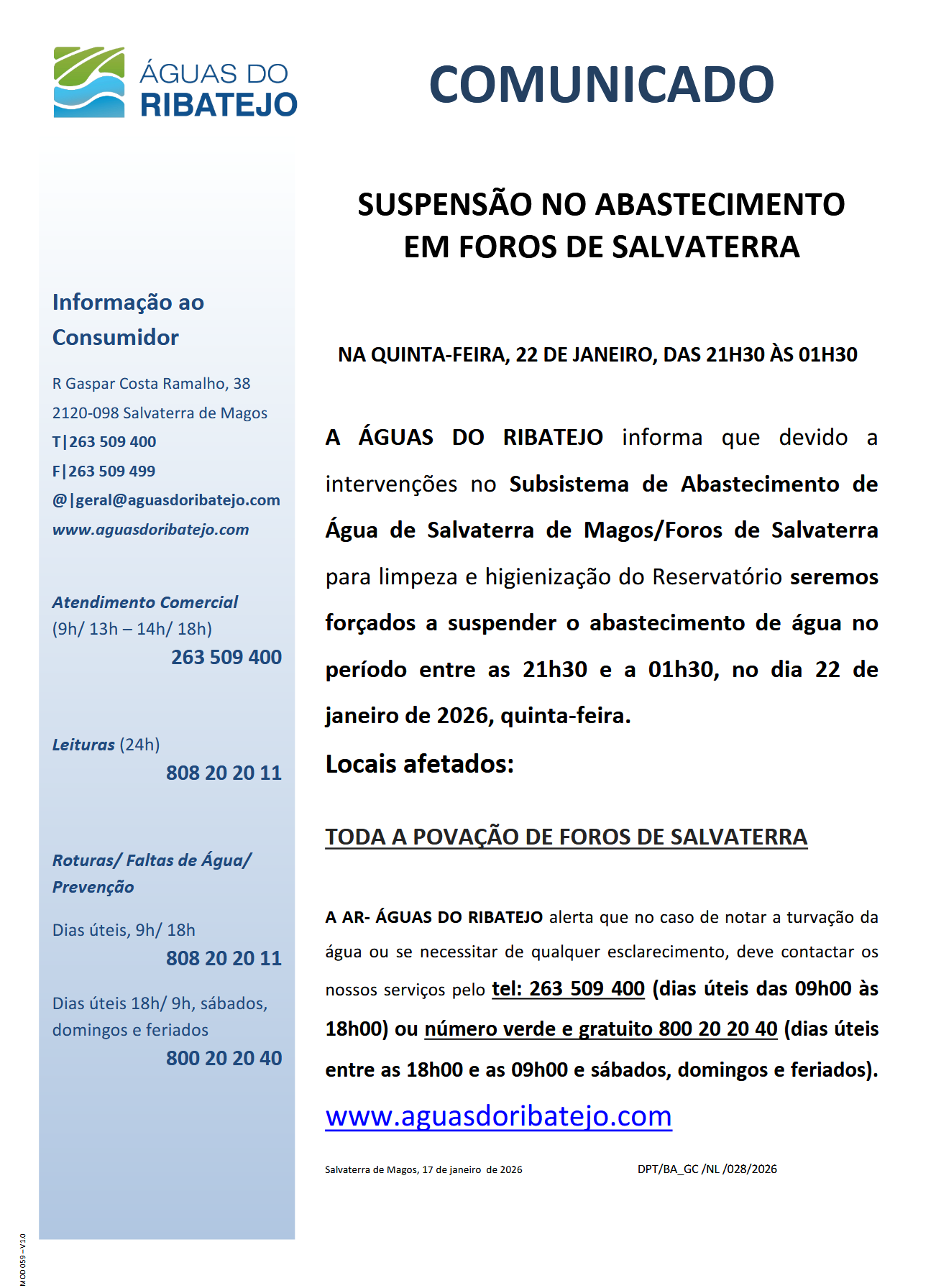 A ÁGUAS DO RIBATEJO informa que devido a intervenções no Subsistema de Abastecimento de Água de Salvaterra de Magos/Foros de Salvaterra para trabalhos na rede, prevemos a suspensão no abastecimento de água no dia 21 de janeiro de 2026 (4ª feira) das 10h às 14h e no dia 22 Janeiro de 2026 (5ª feira) das 8h30 às 11h.
